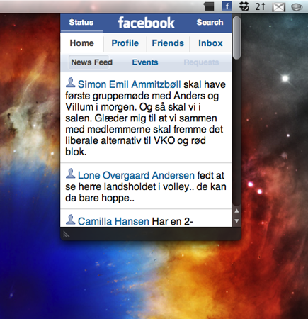 Ovenstående er et eksempel på hvordan jeg har integreret http://iphone.facebook.com i min menu-linje for at give et hurtigt overblik over hvad der sker på facebok (hellere et hurtigt kik, end risikere flere overspringshandlinger ved at åbne “bogen”).